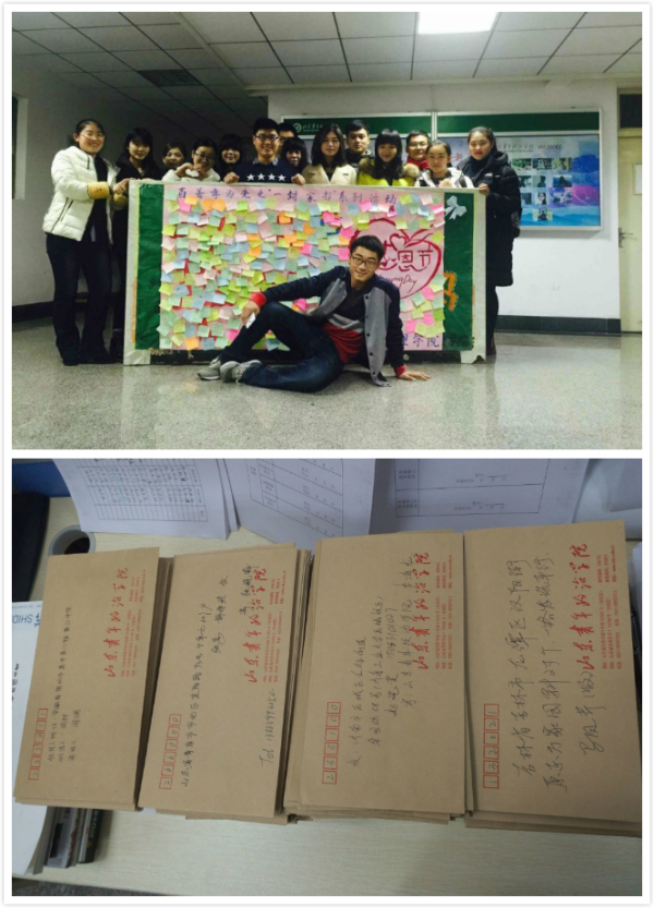 25日,学院各团支部组织了“微孝大爱”祝福语征集活动,同学们拿起纸笔,写下了对亲人和老师的诚挚祝福。同时观看感恩视频、亲情微电影、发起“一封家书”活动,倡议同学们以家书的形式说出心声,表达孝意。26日,各团支部将提前录制的“老师,我想对您说”主题感恩视频通过微信献给老师做为感恩节礼物,感谢老师们的谆谆教导和无私奉献。