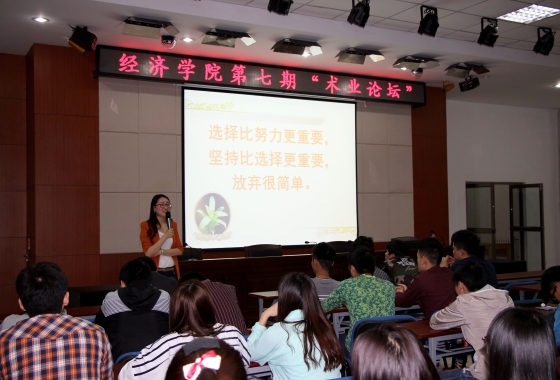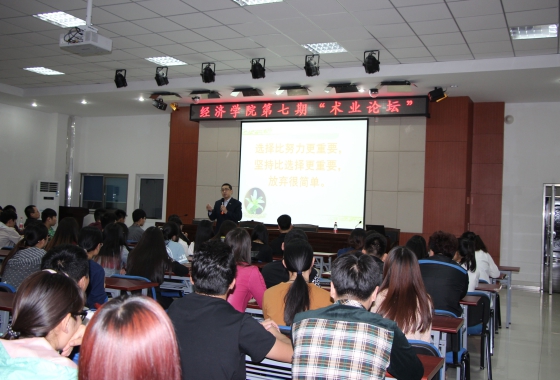 4月23日晚上,经济学院主办的第七期“术·业论坛”在七号公寓培训教室举行。阿里巴巴金牌讲师刘晓楠女士、山东支点电子商务有限公司总经理张学伟先生应邀做了主题为“曾经的自己和现在的你”的精彩演讲。国际经济与贸易专业部分教师及学生聆听了讲座。