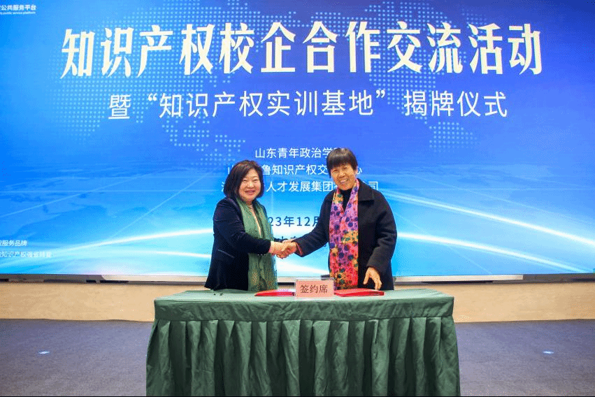 在山东省知识产权公共服务交易大厅,双方举行了“知识产权实训基地”共建签约仪式。李玉英代表学校与山东齐鲁知识产权交易中心桑文新总经理签署《知识产权实训基地共建协议》,双方共同为知识产权实训基地揭牌。