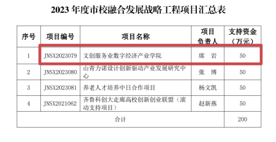 12月27日,济南市教育局发布《2023年度济南市市校融合发展战略工程项目立项通知》(市校项目函字〔2023〕13号),经济管理学院申报的“文创服务业数字经济产业学院”项目获批立项济南市第二批市校融合发展战略工程项目。学院新增纵向科研经费到账80万元,包括第一批市校融合项目的剩余资金和第二批项目的初始资金。