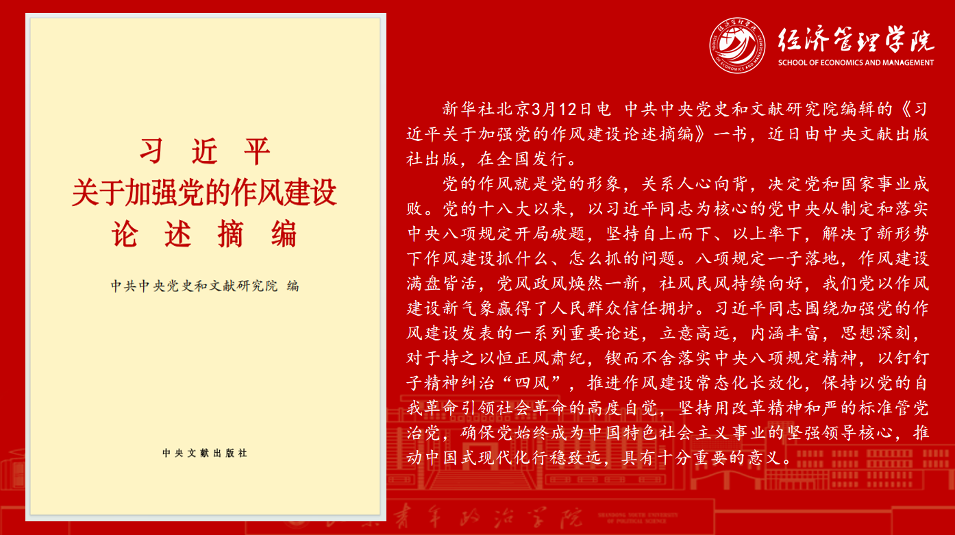 4月21日上午,经济管理学院党委理论学习中心组(扩大)进行集体学习,集中学习了习近平总书记关于加强党的作风建设的重要论述以及《习近平关于加强党的作风建设论述摘编》部分篇目。党委书记张婷婷主持并领学,党委理论学习中心组成员参加,科级干部、全体辅导员列席参会。