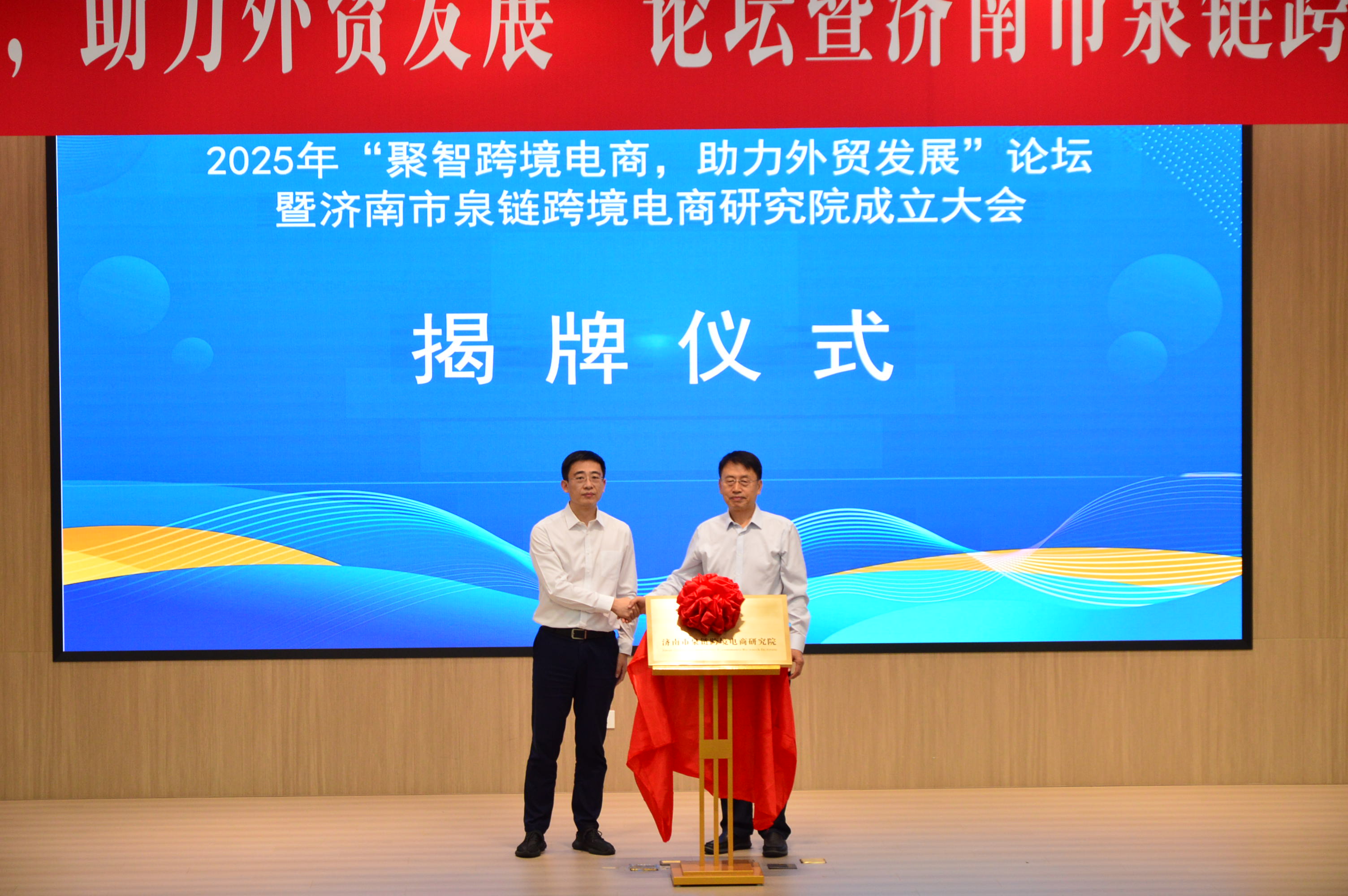 刘燕飞、王培志共同为济南市泉链跨境电商研究院揭牌。工作人员介绍了研究院的发展定位、战略方向以及在智库支持、与驻济高校合作等方面的相关情况。随后,济南市泉链跨境电商研究院与驻济高校代表签订了战略合作协议。