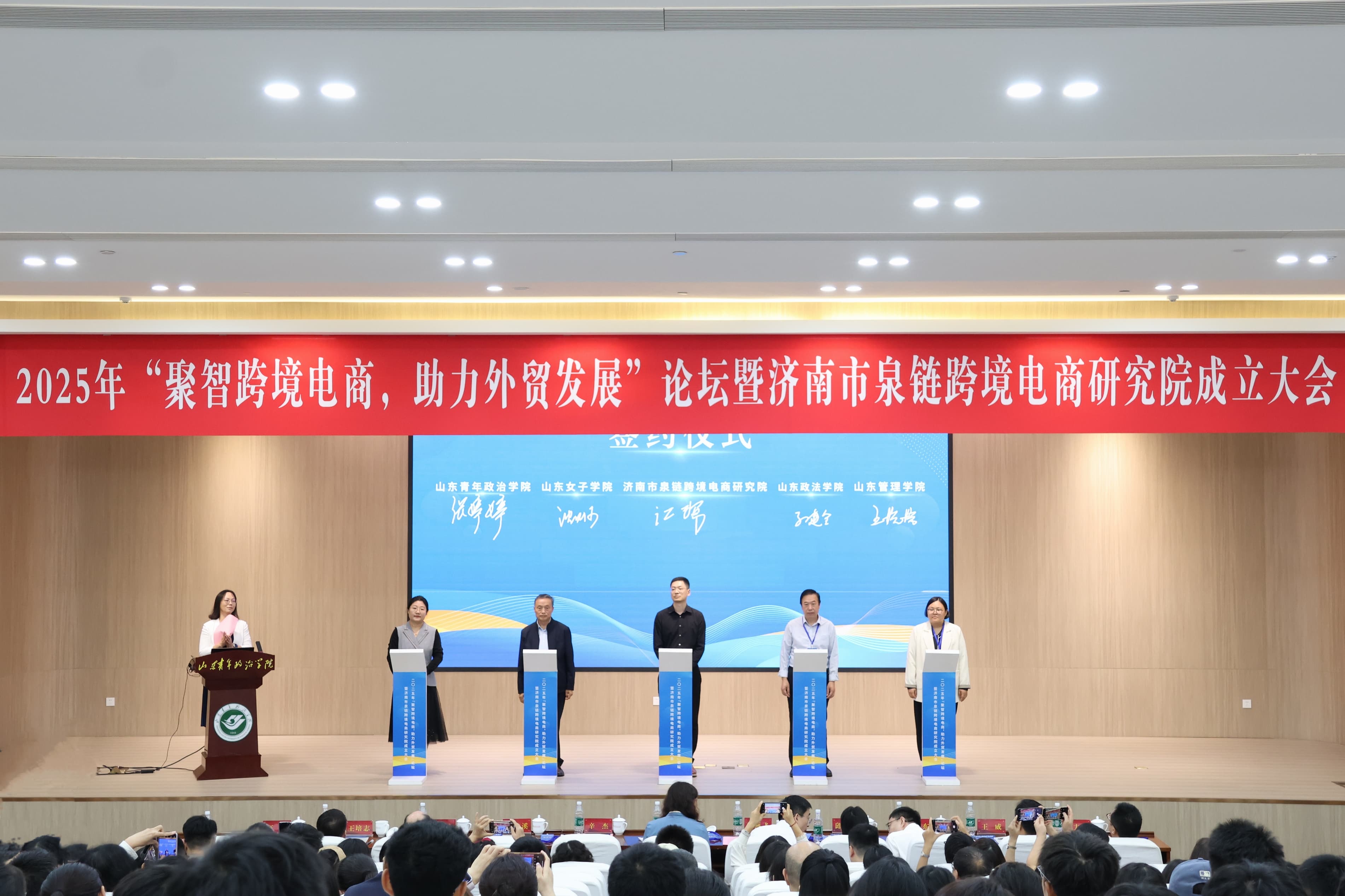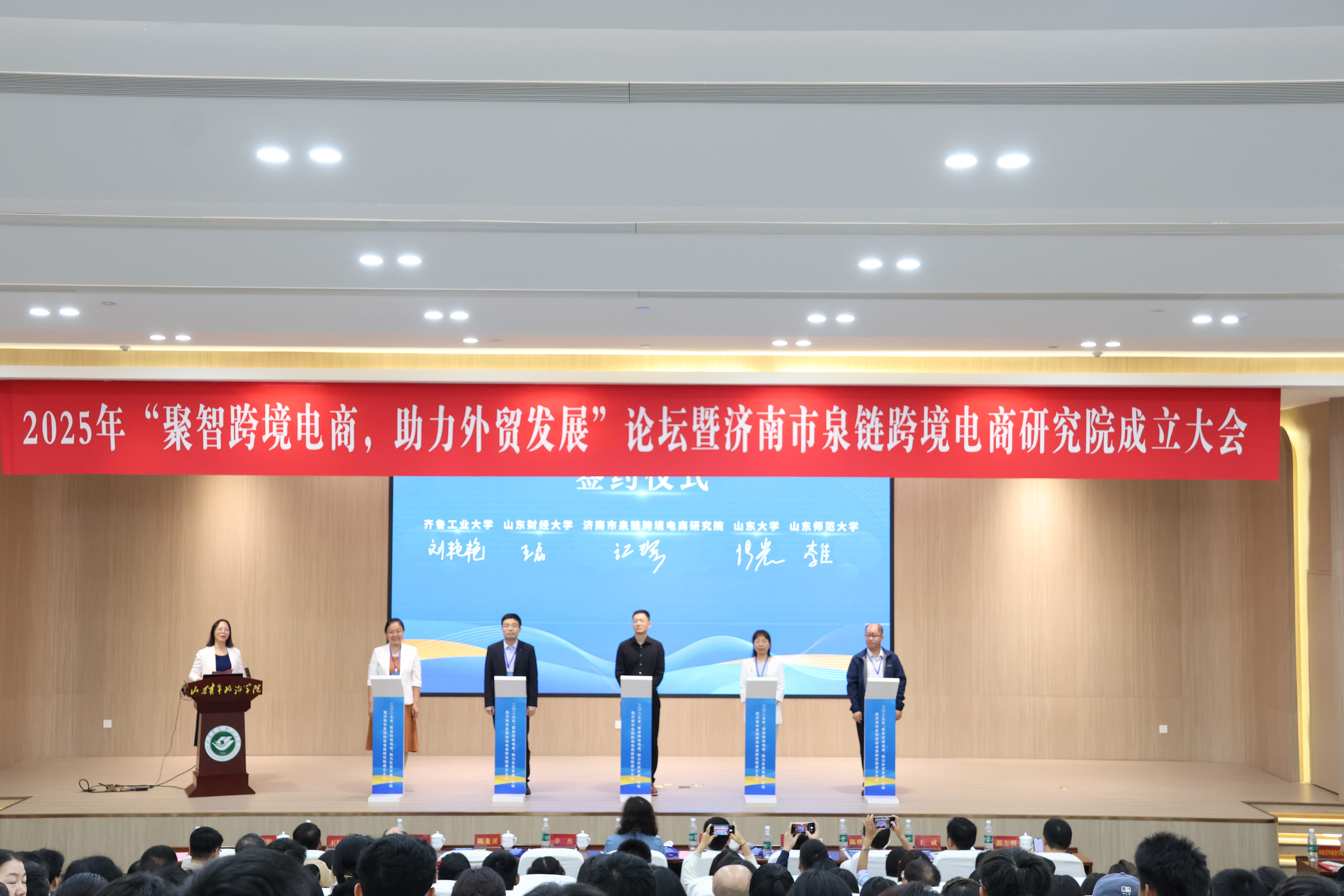 9月27日上午,“聚智跨境电商,助力外贸发展”论坛暨济南市泉链跨境电商研究院成立大会在学校举办。本次活动在济南市商务局、济南市商务促进中心的大力支持和指导下,由济南市泉链跨境电商研究院、中国(济南)跨境电子商务综合服务平台联合主办,我校与山东省对外经济学会联合承办。学校党委副书记、院长辛杰,党委委员、副院长陈龙溪,济南市泉链跨境电商研究院院长、山东省对外经济学会会长王培志出席会议。山东省商务厅对外贸易处处长马翎,济南市商务局党组成员、副局长刘燕飞,济南市商务促进中心党总支书记、主任邱美艳,济南市商务局对外贸易处处长陈曙东等受邀参会。大会由学校经济管理学院院长席岩主持。