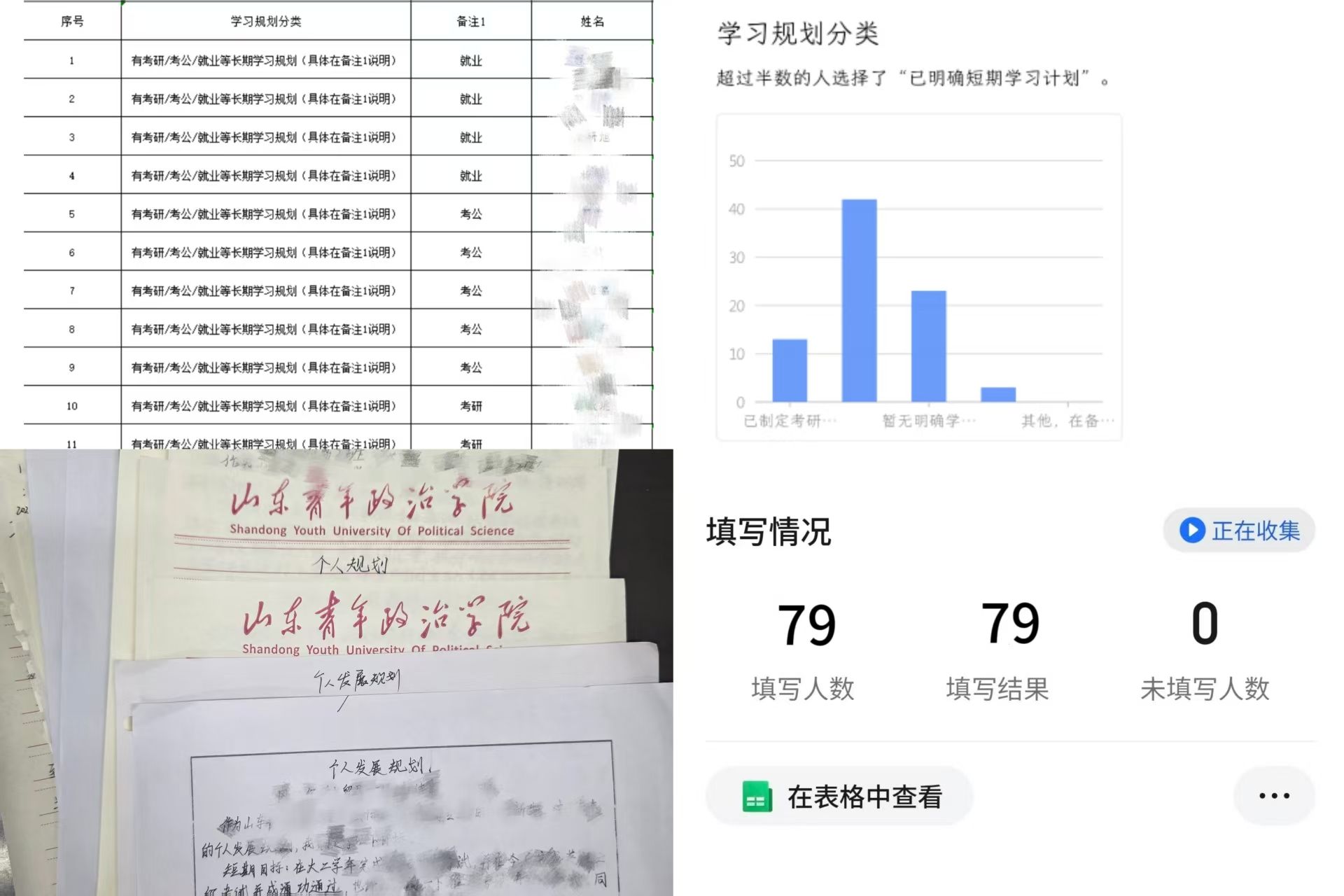 深入调研,精准把握学生需求动向。为确保学业指导工作更具针对性,学院首先面向2025级学生开展了全方位、深层次的学业指导需求摸底调研。各专业辅导员通过发放并回收有效调查问卷500余份,结合大量一对一深度访谈,系统摸排了2025级学生在考研、就业、学业能力提升等不同方向的发展意向,全面掌握学生当前学习状态、短期目标设定、长期规划困惑等核心信息。基于数据分析,学院将学生初步划分为“考研深造意向型”“就业考公导向型”及“发展目标暂未明确型”三大群体,详细梳理了各类群体的核心需求与关注焦点,为系列活动的分层分类开展奠定了坚实基础。
