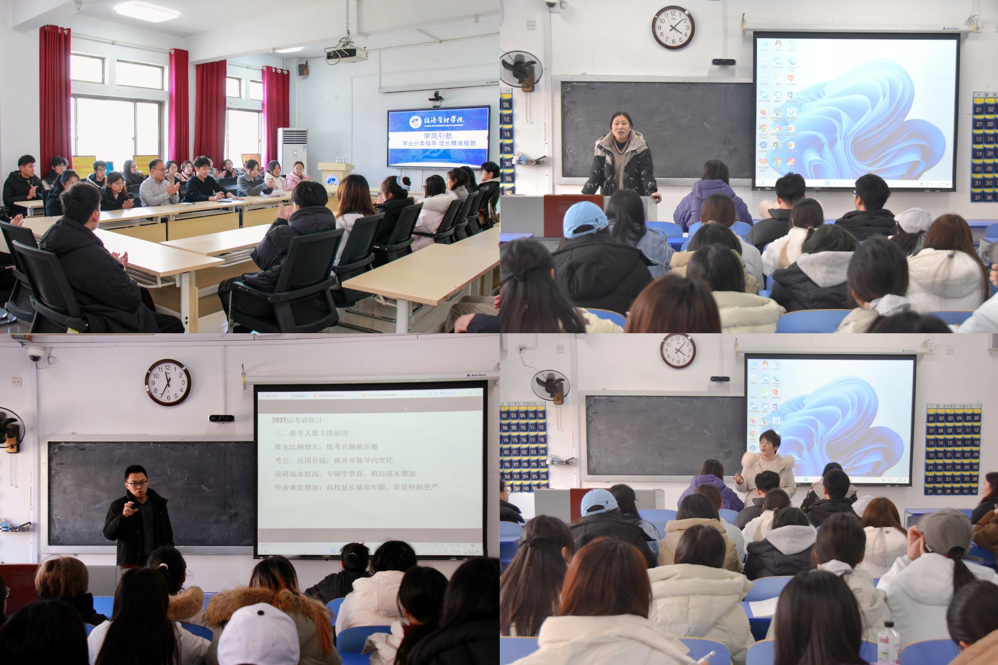 分层施策,多措并举破解学业困惑。围绕三大群体的差异化需求,学院精准发力、多措并举,切实破解学生学业困惑。对于“发展目标暂未明确型”学生,学院以主题班会为抓手,夯实学风基础。在国际经济与贸易、市场营销专业的班会上,辅导员与专业教师协同发力,解读多元成长路径、在校学习重点,并组织分组讨论,引导学生结合自身实际主动思考考研与就业的适配性,初步确立学业目标。班会内容还紧密结合期末考试诚信教育,引导学生端正学习态度。对于“考研深造意向型”与“就业考公导向型”学生,学院则开展专项指导。考研指导方面,人力资源管理、经济学专业教研室骨干教师举办专题辅导,系统解读考研趋势、院校选择策略、备考规划与核心科目学习方法,着重强调夯实专业基础、搭建系统化知识框架的重要性。就业考公指导方面,人力资源管理专业组织就业规划座谈会,辅导员与专业教师协同发力,深入分析当下就业市场需求趋势、行业核心岗位能力要求,并针对考公、求职技能提升等热点问题答疑解惑。同时,学院积极搭建朋辈引领平台,邀请人力资源管理专业高年级优秀学子分享考研备考经验,经济学优秀校友返校交流考公历程与职场体会,通过真实案例增强学生规划的信心与行动力。