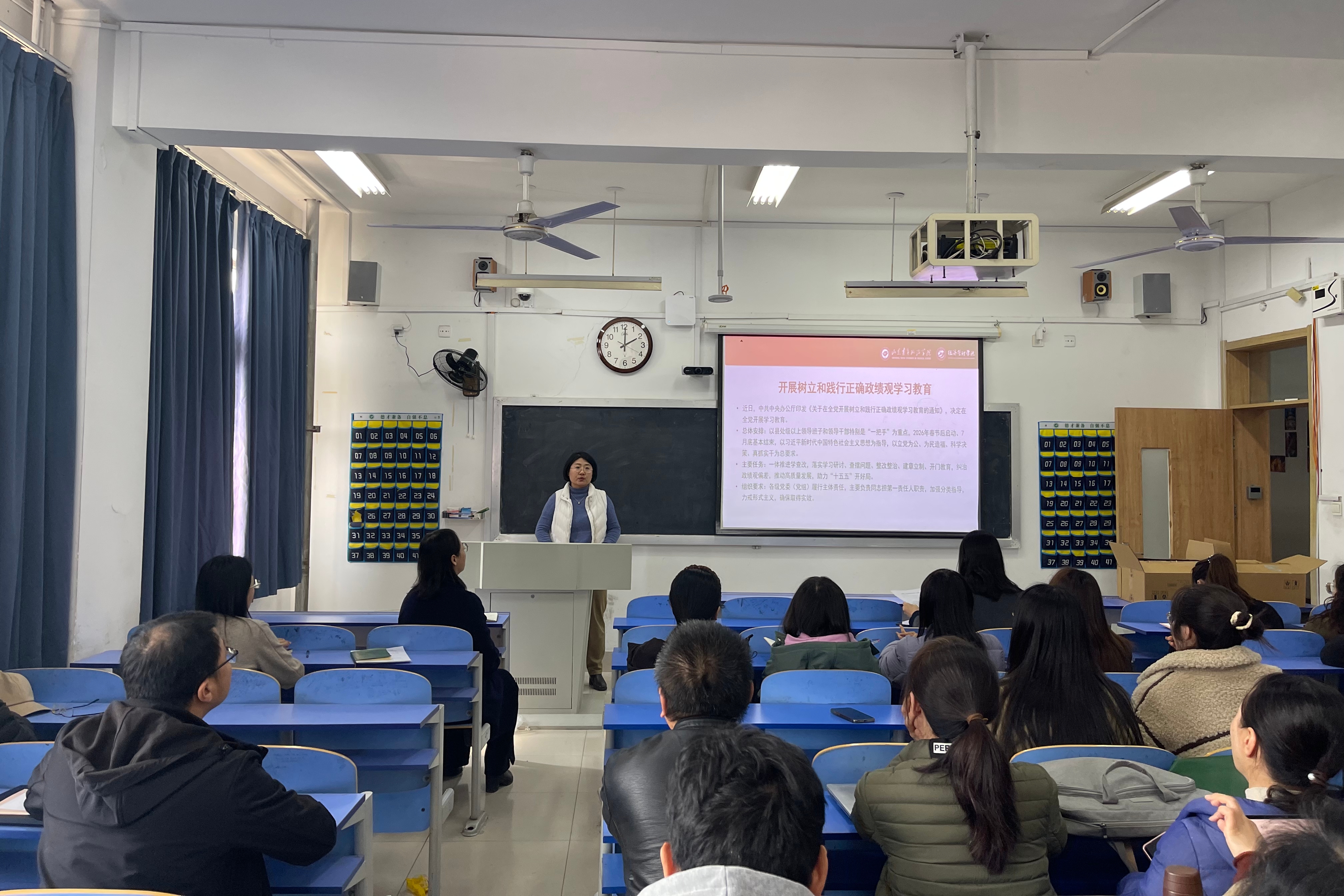 覆盖全员全程,营造浓厚氛围。学院召开全体教职工大会,面向全体教师启动树立和践行正确政绩观学习教育。传达相关工作安排,围绕“什么是正确政绩观”“为什么要树立正确政绩观”“怎样践行正确政绩观”等内容开展学习,推动正确政绩观内化于心、外化于行。各师生党支部迅速响应,依托“三会一课”、主题党日,组织开展学习教育活动和专题学习,实现党员全覆盖,切实将学习成果转化为推动学院内涵式发展的强大动能。