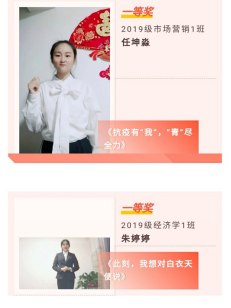 “传承五四精神·彰显青年担当”微团课宣讲活动。五四期间,全体学生团干部纷纷围绕爱国、党史团史、伟人青年故事,先进事迹以及新冠肺炎疫情暴发以来的所见所闻、所感所想等表达所感所想,积极参与微团课宣讲活动,号召青年大学生应有担当,讲奉献,坚定制度自信,用奋斗实现理想,为社会做出更大贡献。2019级经济学普本1班团支书刘蕾提到:无论在哪个时代,青年人都是肩扛社会大任,推动社会发展的中流砥柱,我们应不负韶华,共同振兴中华!