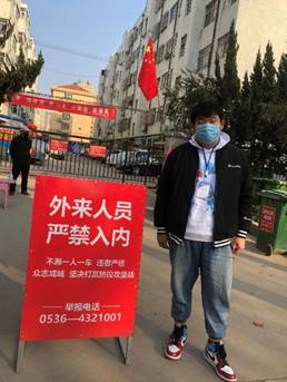 王朝阳,男,2018级市场营销专业2班班长,入党积极分子,家住山东省潍坊市安丘市经济开发区。因开发区社区较多,人员复杂,疫情防控工作力量异常薄弱。得知这一情况,王朝阳立即主动向开发区党工委请缨,参加经济开发区社区里的疫情防控志愿者活动。从正月初三开始,王朝阳每天都坚守在防疫一线,在社区门口重复着对进出人员排查与信息登记,对入村车辆进行登记和消毒,还有不定期入户排查登记等工作。