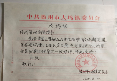 学生的良好风貌也是学院的活名片,收到的表扬信即是对学生个人能力的认可,也是对山青文化的宣传。通过“青春引擎”暑期社会实践学生更多接触社会和服务社会,既培养了学生骨干的坚定政治素养、深厚学养和基础性基层工作能力,又为区域经济社会发展和共青团事业贡献了力量。