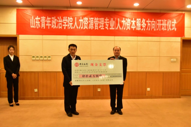 王林山代表山东青年政治学院接受济南人力资本产业研究院执行副院长王安中的助学捐赠。经济管理学院院长李亚光介绍了校企合作专业筹建过程、课程及实验室建设工作进展、协同工作机制和未来发展规划等。学生代表李跃贤做了发言,表示要做有才、有绩、有信、有价的山青学子。大家集体观看了宣传片。济南人力资本产业研究院还赠予学生每人一个开学礼包。