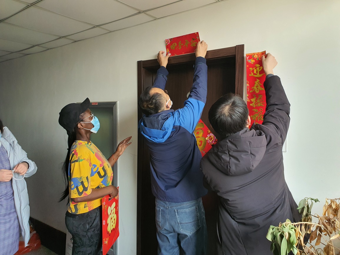 2月10日腊月二十九,辞旧迎新之际,我校国际学生公寓喜气洋洋。学生工作部(处)、国际交流合作处、经济管理学院相关领导及辅导员、教师代表共同为假期留校国际学生贴福字、贴春联,一同迎接新年的到来。