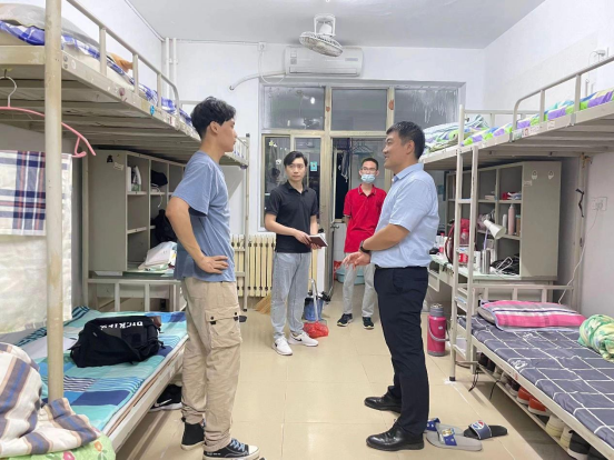 调整生活节奏,强化自我管理,踔厉奋进新学期。班会后,学院党委副书记任正实与各专业辅导员、助班共同走进学生公寓开展走访慰问活动。走访中,任正实围绕“入学报到是否顺利”、“是否适应新的校园生活”等亲切地同学生交谈,他提醒同学们要提高自我保护意识,高度警惕电信诈骗、用水用电等安全问题,并就校园疫情防控工作做了进一步讲解,希望同学们能尽快适应大学生活,更快更好地进入角色。