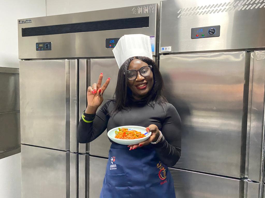 活动伊始,厨师为来自刚果(金)、喀麦隆、赤道几内亚、几内亚比绍4个国家的留学生代表们讲解并展示了菜品的详细制作过程,厨师精湛的刀工和娴熟的烹饪技术激发了现场留学生浓厚的兴趣。在大厨的精心指导下,认真学习“糖醋里脊 、孜然羊肉、金汤肥牛、剁椒牛肉”等鲁菜烹制,切身感受新鲁菜文化。来自刚果(金)的留学生Dorcas看着自己亲手烹制出的第一道新鲁菜难掩兴奋之情向工作人员展示自己的鲁菜作品。