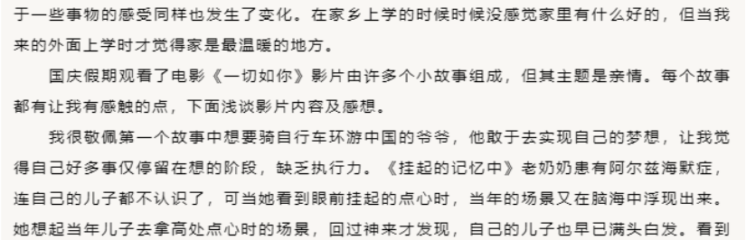 观看一部感恩电影,感悟初心使命。通过组织学生观看以“养老、孝老、敬老”为主题的电影《一切如你》,引导同学们跟着镜头,去体悟老人的现实生活,感受孝亲敬老的可贵。2021级市场营销专业的路嘉琦在观看后分享到,《一切如你》整部影片看下来,我更希望能多陪陪父母和奶奶,不要在来不及的时候后悔,更要勇敢去追求梦想,珍惜生活中点滴幸福,成为一个更阳光、有上进心的人。