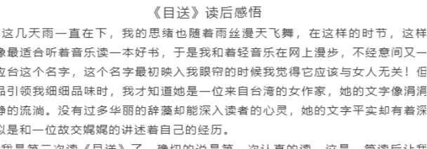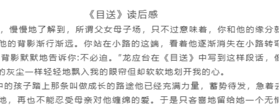 品读一本好书,思考亲情人生哲理。为让学生更深刻地感悟亲情,此次活动增加了读书环节,通过组织青年学子品读散文集《目送》,跟随作者在书中领悟对父亲、母亲的思念、对朋友的牵挂,并写下品读感悟,引导学生更深刻的思考人生哲理。活动结束后,大家感慨万千,纷纷表示今后要对父母更好一点,在校要努力成为更优秀的人,以更好地报答父母。
