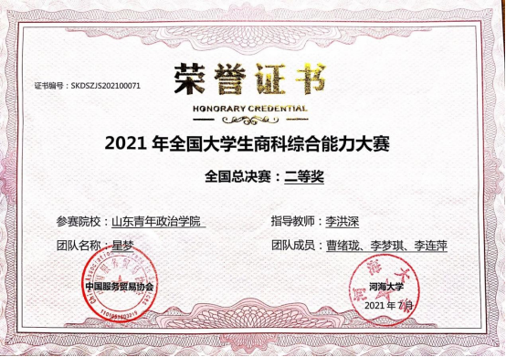 7月16日至17日,全国大学生商科综合能力大赛总决赛在线上举行,经济管理学院李洪深老师指导的人力资源管理专业曹绪珑、李梦琪、李连萍团队获得全国总决赛二等奖。此次竞赛共有来自武汉大学、中南财经政法大学、安徽大学、合肥工业大学、南昌大学、江西财经大学等近百所高校的代表队参加。