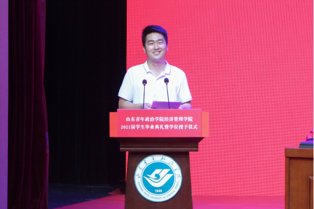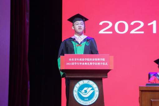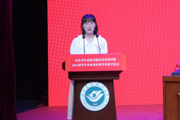 毕业生代表2017级经济学专业仝西宁进行发言。他代表2021届全体毕业生向母校、向恩师、向父母表达了感恩之情,表示将带着对国家、对人民的责任,去实践“德才兼备,自强不息”的校训,让毕业骊歌成为精彩人生的崭新序章。2018级国际经济与贸易2班的王皓月代表全体在校生说:“感谢朝夕与共的师哥师姐们对我们的关心和帮助、鼓励和安慰,请你们放心,我们一定会像你们一样认真刻苦、积极奋发、坚定初心、一往无前,以自己优异的成绩,用自己的实际行动为母校的发展进步贡献我们的青春和力量。”