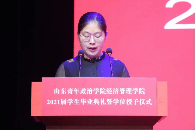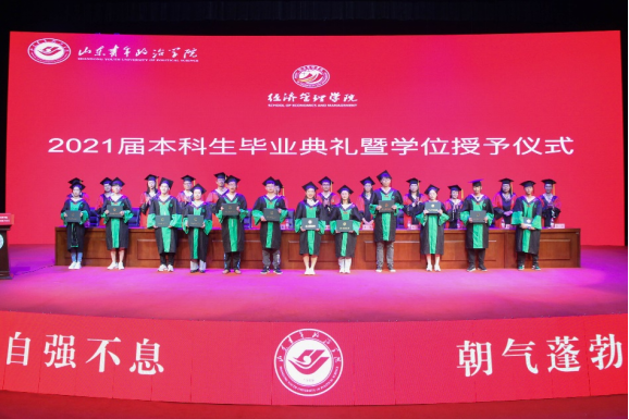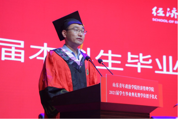 6月24日上午,经济管理学院2021届毕业典礼暨学位授予仪式在山青剧院举行。山东青年政治学院国际交流合作处处长席岩、经济管理学院院长李亚光、党总支书记辛德军、副院长李鹏、副院长万利、党总支副书记张冰、副院长崔恺媛、经济学教研室主任张双娜、国际经济与贸易教研室副主任王俊、市场营销教研室副主任杨敏、人力资源管理教研室副主任王箐、国际教育教研室主任张金出席典礼。毕业生辅导员、班主任、教师代表、优秀校友代表、2021届600余名毕业生及部分家长参加了本次毕业典礼暨学位授予仪式。典礼由辛德军主持。