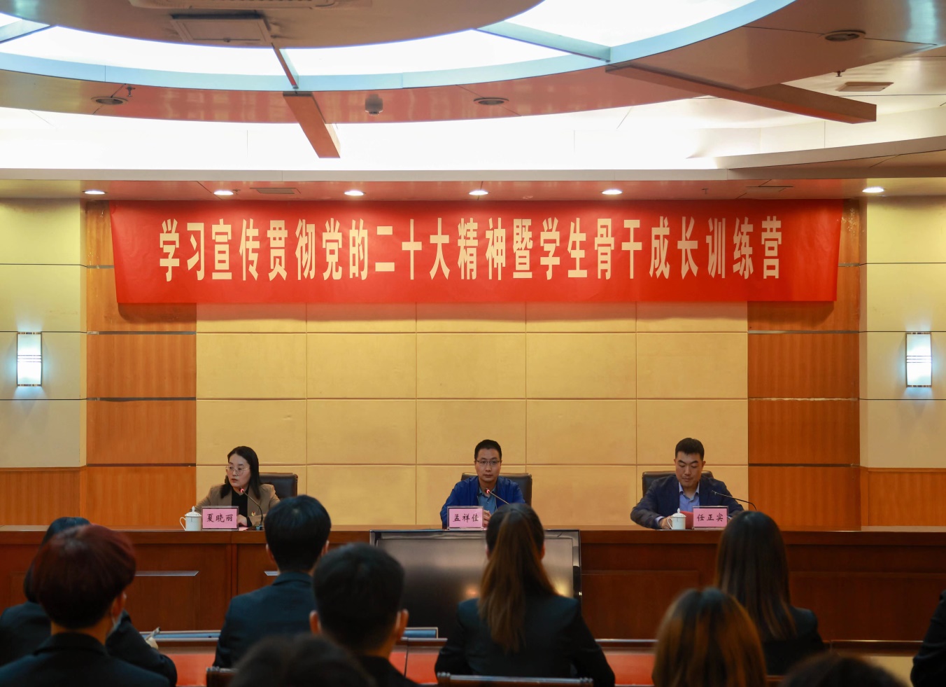 伴随着庄严团歌的响起,“学习宣传贯彻党的二十大精神暨学生骨干成长训练营”开营仪式正式开始。活动伊始,任正实介绍了训练营的基本情况和培训目标;学生骨干代表杨佳迪进行了发言,她号召全体学生骨干珍惜此次学习机会,积极发挥模范带头作用,以实际行动践行党的二十大精神。孟祥佳对训练营全体学生骨干提出了希望和要求:一是坚定理想信念,勇于担当使命,要坚定政治信仰,保持崇高理想,带头深入学习宣传贯彻党的二十大精神,坚定信念跟党走;二是坚持知行合一,锤炼工作本领,要善于在学习中增长知识、锤炼品格,在实践中增长才干、练就本领;三是树立榜样标杆,争做先行表率,作为学生骨干,要积极发挥在同学中的影响力、凝聚力和号召力,通过自身的示范引领把广大同学紧紧团结在党的周围,听党话、跟党走,努力成长为有理想、敢担当、能吃苦、肯奋斗的新时代好青年。