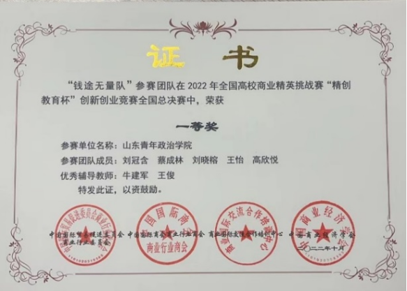 近日,2022年全国高校商业精英挑战赛“精创教育杯”创新创业竞赛全国总决赛落下帷幕。全国总决赛共有来自340余所院校的1417支队伍参赛,约8000名师生共同参与。经过层层角逐,我校经济管理学院参赛学生团队“钱途无量队”获得全国一等奖。牛建军、王俊老师荣获“优秀辅导教师”。刘冠含(队长)、蔡成林、刘晓榕、王怡、高欣悦5位同学组成的参赛团队克服疫情带来的种种困难,团结拼搏,终于取得佳绩。