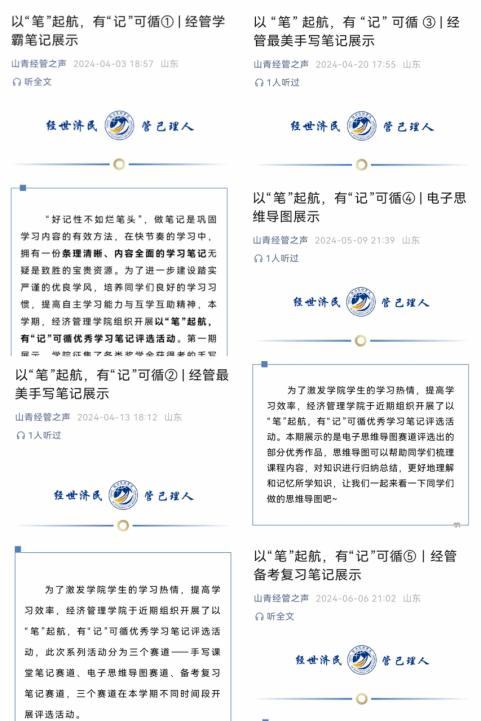 本次系列活动分为手写课堂笔记赛道、电子思维导图赛道、备考复习笔记赛道三个赛道,收到了200余份参赛笔记,涌现了一批形式多样、内容全面、条理清晰、排版美观的优秀作品,学院悉心评选出了每个赛道的一、二、三等奖,并在学院微信公众号上进行了5期宣传展示。无论是各个科目的课堂笔记、各项考试的备考笔记,还是对所学内容进行归纳总结的思维导图,都凝聚了学生的思考与努力,记录了学生认真学习、提高个人综合能力的过程,展现了经管学子勤奋踏实的学习态度。通过此次活动,进一步提高了学院学生学习的积极性与主动性,培养了学生良好的学习习惯,提高了学习成效。