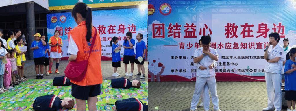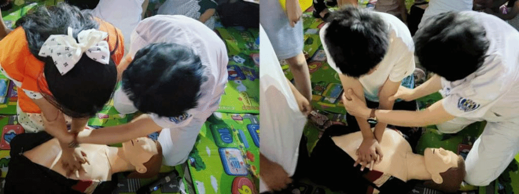 此次暑期社会实践活动分为学习阶段和实践阶段。在观摩学习阶段,专业老师及人员通过现场展示专业动作,帮助志愿者学习急救知识,包括心肺复苏、海姆立克、紧急包扎等。在展示过程中,专业人员还解释了动作要领以及原理,让团队成员们更好的学习专业急救知识,掌握动作要领。