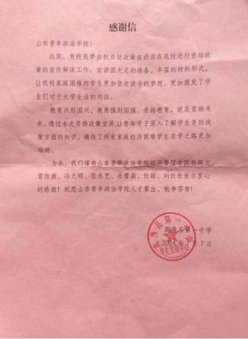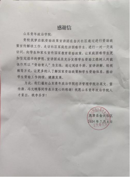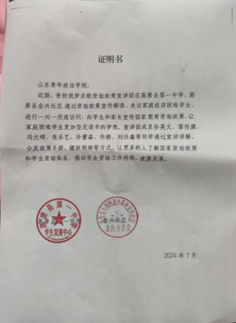 为深入贯彻落实国家资助政策,加强对学生资助政策的宣传和教育,确保家庭经济困难学生得到有效资助,加深当地学生、群众对资助政策的理解与认同。7月,经济管理学院“筑梦启航”资助政策宣讲团赴山东省聊城市高唐县开展“乘资助之风,向未来筑梦”主题资助政策宣讲社会实践活动。